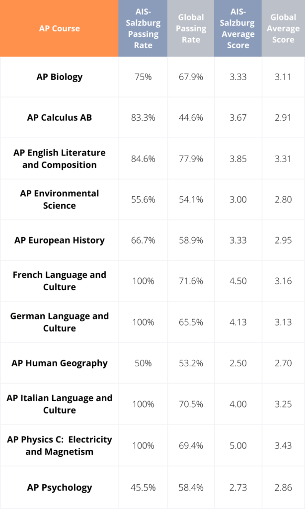 Although very challenging and dependent, to a great extent, on having experienced and highly-knowledgeable instructors to deliver the material to high school students, AP coursework represents the centerpiece of the AIS-Salzburg program of preparation for university. Given this, we are very proud of the continued success of our students to both achieve remarkable success on AP Examinations, but also take direct steps toward gaining access to some of the best universities worldwide. We are remarkably proud of you!