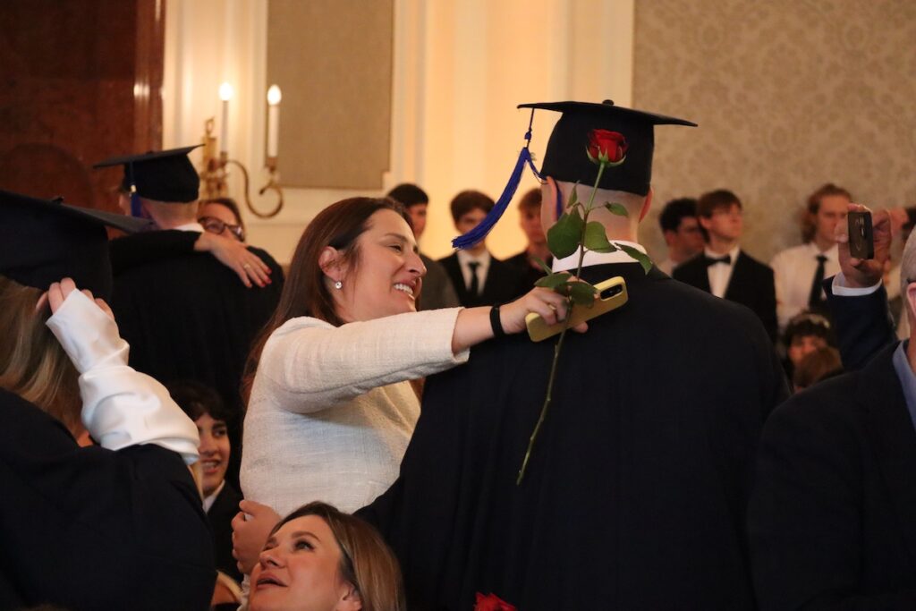 While the Pro Musica Quartet played Mozart’s Divertimento in D, accompanied by Ms. Monger on the French horn, the graduates the graduates left their seats and presented a rose to their family members and loved ones; a touching and emotional expression of their gratitude and appreciation to those who supported and strengthened their resolve again and again. The photos and video below capture this special moment.
