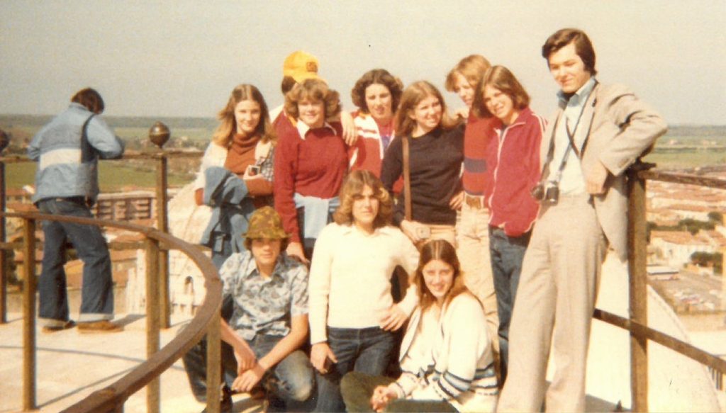 Photo: Diana (bottom right, striped shirt) and SIPS classmates in Pisa, Italy in 1978.