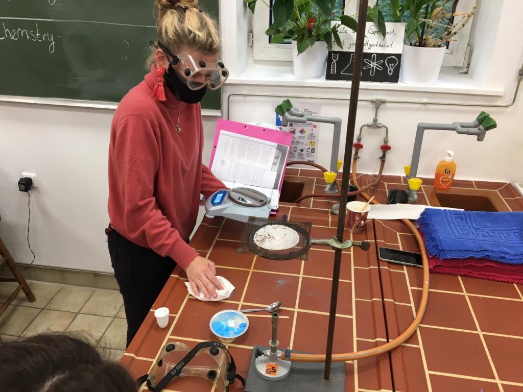 In chemistry class, 11th grade students heated a hydrated copper sulfate to drive off the water of crystallization and use the mass differential to determine how many molecules of water are associated with each molecule of hydrated copper sulfate. In hydrated form, the copper sulfate forms brilliant blue crystals; in anhydrous form, copper sulfate is a white powder.