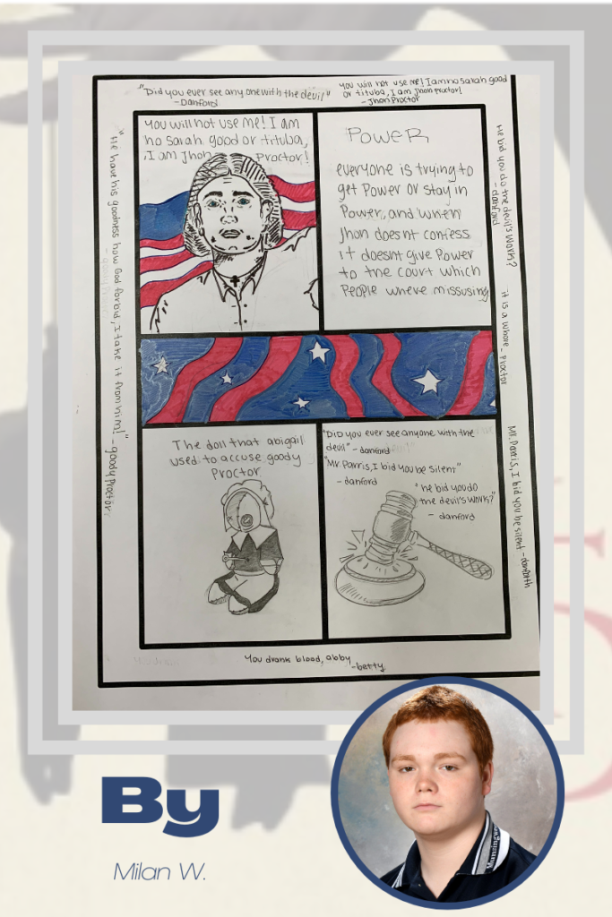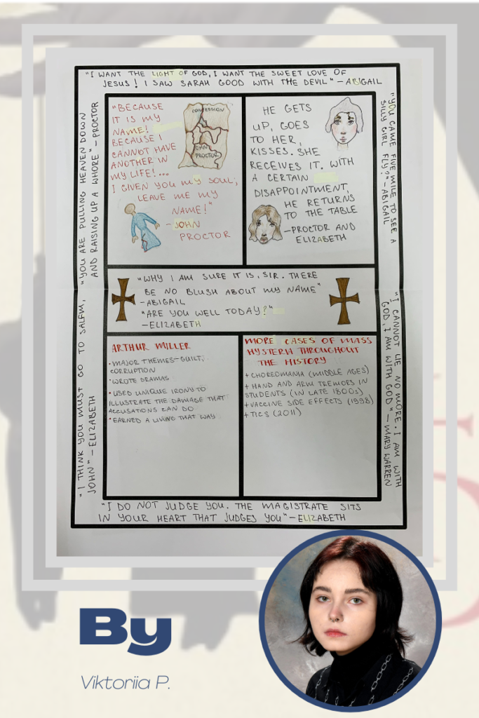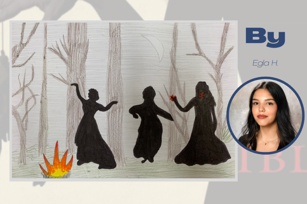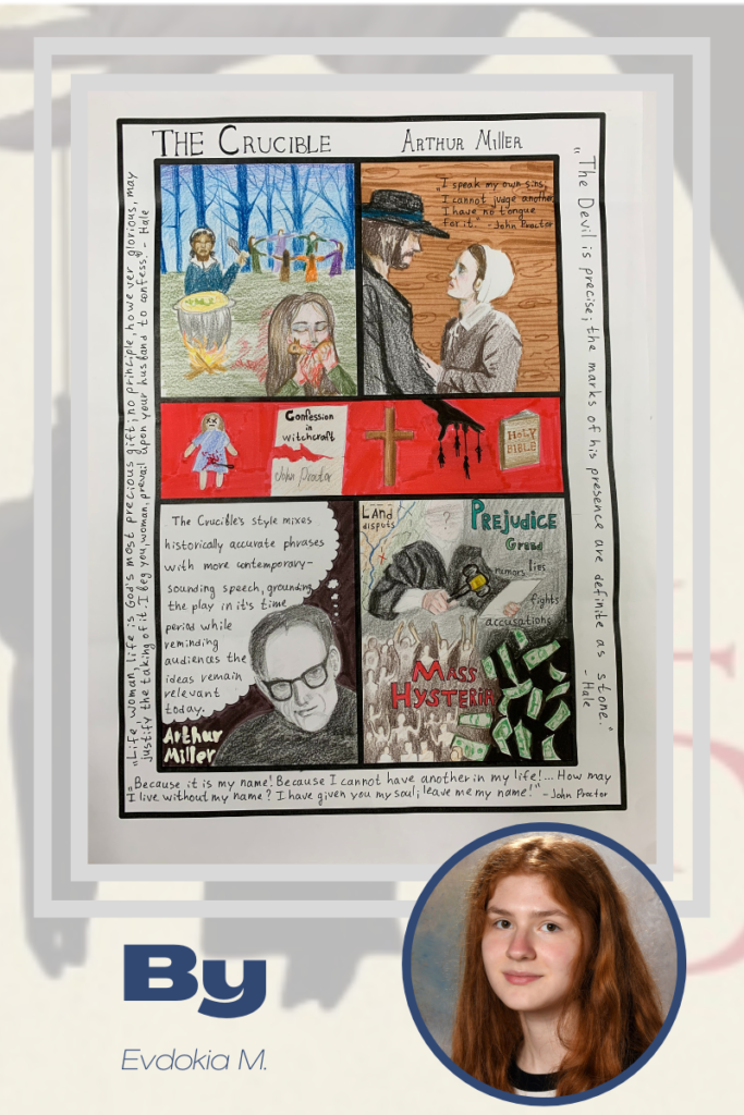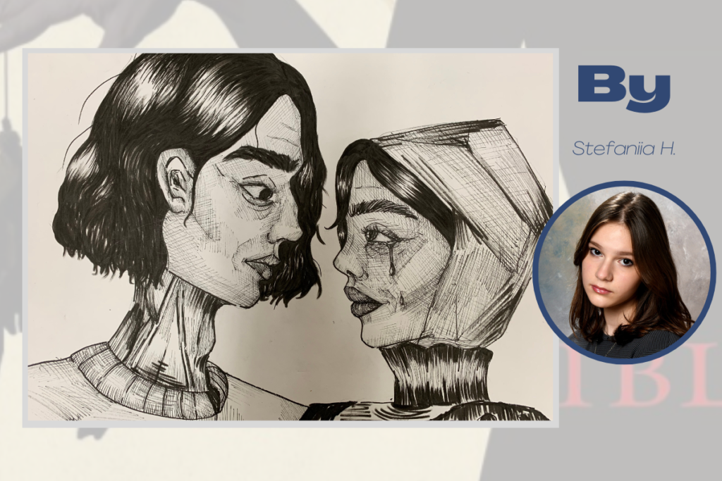 In English 10 Composition and Literature class with Ms. Anderson, students had the option to illustrate the most important scene in The Crucible by Arthur Miller. Egla H. chose to illustrate a scene (spoken of but never shown in the play) of the Salem girls dancing in the forest. Abby’s face has a smear of blood: a sign of the murderous witchcraft she has just conjured. Stefaniia H. illustrated one of the last scenes in the play, in which John and Elizabeth Proctor bid each other farewell. We invite you to view the work of both Egla and Stefaniia below.