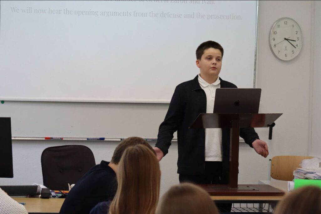 Photo: 9th-grade student, Volodymyr B., presents his argument in a mock trial in the fall of this school year.